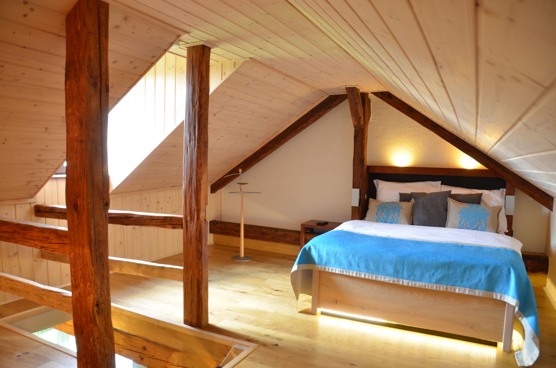 Stylový pokoj s přiznanými trámy, dřevěnou podlahou, výhledem do okolní venkovské krajiny a koupelnou. Možnost přistýlky.